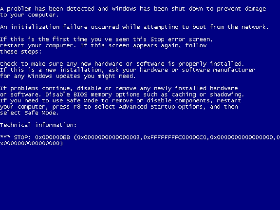 On init a PXE client relies on its NIC's firmware providing a TCP/IP stack and DHCP+TFTP client capabilities. Of course all these services run on top of a network driver also included on NIC's firmware. But there's a point on the network install process where the previous network stack is replaced by one provided by the OS being installed (RIS). At this point we can be informed that a required network driver is not available or that it failed doing its job. This is probably the most common error we might come across on a Microsoft OS network install.